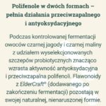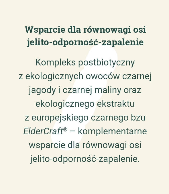 Zaawansowany proces fermentacji owoców czarnej jagody i czarnej maliny z ekstraktem ElderCraft®. Formuła zaprojektowana z myślą o osi jelito–odporność–zapalenie.