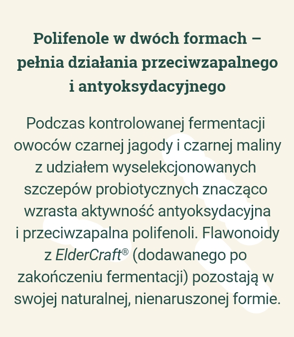 W formule Immunaxis ekstrakt ElderCraft® został wprowadzony po zakończeniu procesu fermentacji, dzięki czemu zawarte w nim związki polifenolowe pozostają w swojej naturalnej, nienaruszonej formie. W ten sposób tworzą one komplementarne uzupełnienie biotransformowanych polifenoli z czarnej jagody i czarnej maliny, rozszerzając spektrum działania formuły o niefermentowaną frakcję o potwierdzonej klinicznie bioaktywności.