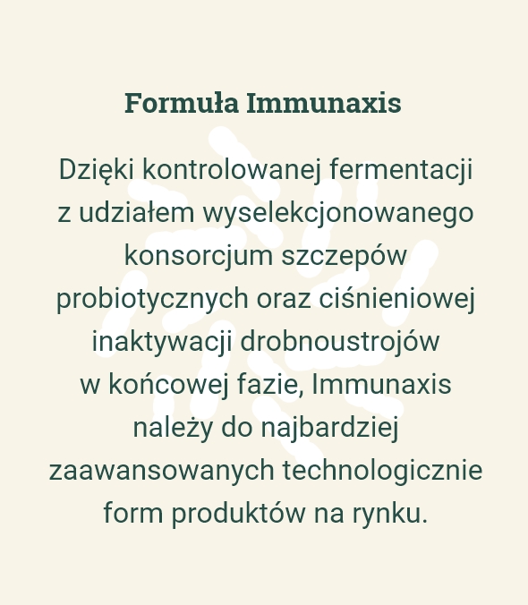 Tworząc Immunaxis, zależało mi na formule, która obejmuje wiele aspektów – od roli mikrobiomu w modulacji układu immunologicznego, przez funkcjonowanie układu odporności śluzówkowej, aż po mechanizmy utrzymujące równowagę procesów zapalnych. Wspólnie z mikrobiologami od lat specjalizującymi się w procesie kontrolowanej fermentacji z udziałem szczepów probiotycznych stworzyliśmy jeden z najbardziej zaawansowanych technologicznie produktów na rynku. A wisienką na torcie jest koktajl dwóch form polifenoli: postbiotycznych – powstałych w procesie fermentacji owoców czarnej jagody i czarnej maliny, oraz nienaruszonych – obecnych w jednym z najlepiej udokumentowanych klinicznie standaryzowanych ekstraktów z czarnego bzu.